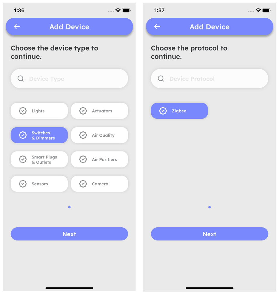 - Select Switches & Dimmers option, then select Zigbee and click Next.