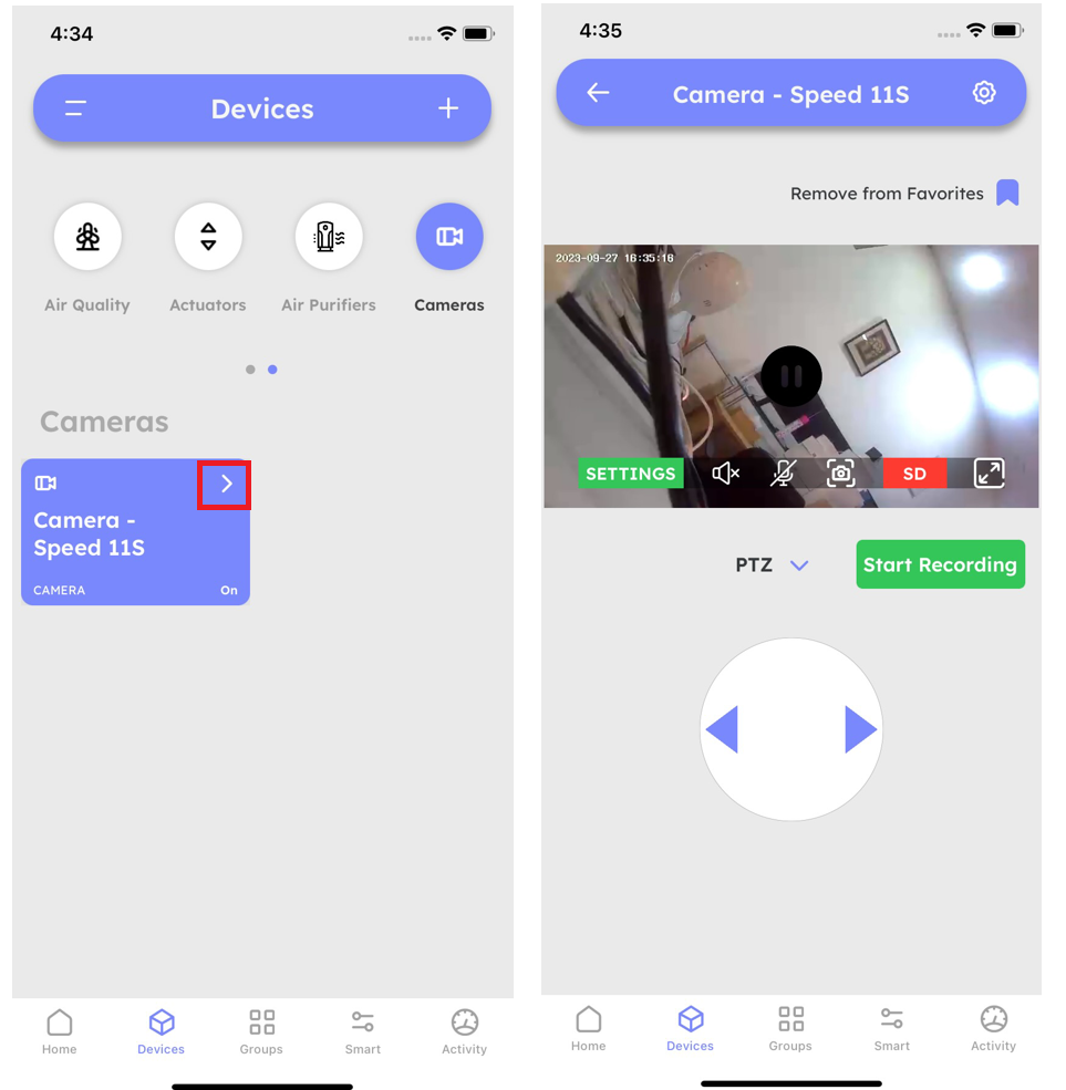 Click on the right arrow “>” icon located on the upper right corner on the camera device card to see the options to control that camera.