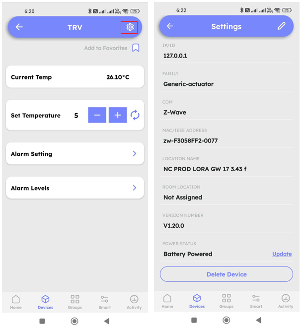 - More settings can be accessed by clicking on the settings (gear) icon located on the upper right corner on the device card.