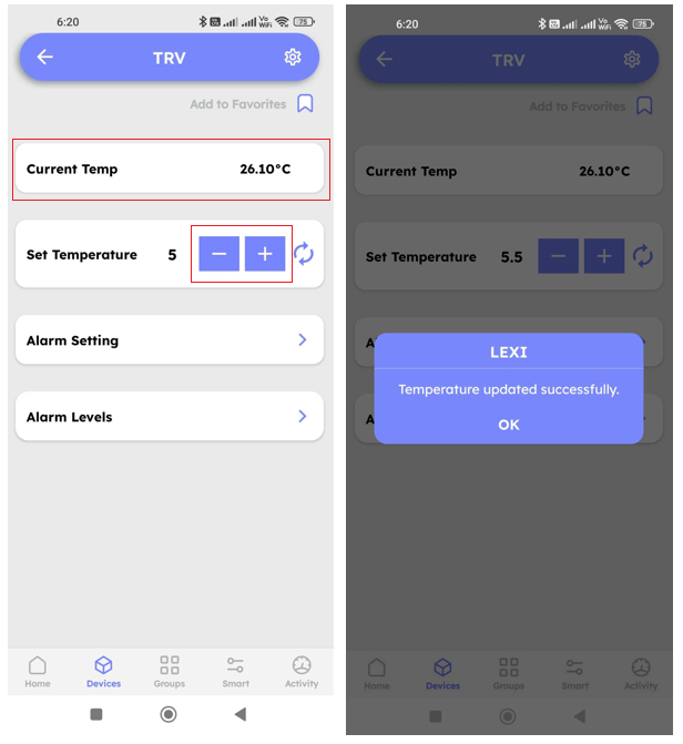 LED screen with your app. Please rotate the Rotary plate on the TRV till the LED screen shows the temperature as 05. Now match this temperature in your LEXI app to sync the TRV temperature with your app.