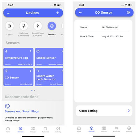 Viewing data collected by your CO Sensor is easy Open your LEXI app, and navigate to Devices -> Sensors. Click on the right arrow “>” icon located on the upper right corner on the device card to see the data collected by your CO Sensor.